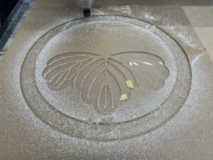 とうとう円の部分の彫刻も終わり、花の部分を彫っています。彫った部分を見ていると家紋の大部分を彫り終わり、もう少しで完成!という感じがします。本日朝7時くらいから掘り始めて、この状態の時は16時30分ですので9時間半彫っていますからね。今機械が何かの原因で止まったら、、、と考えると恐怖しかありません。しかし、例えば停電で機械が止まってしまっても電気が復旧すれば途中から再開できる機能があるので大丈夫です。